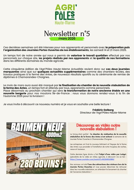 Depuis la fin d'année 2025, l'Agri'Pôles Haute-Marne, le regroupement des établissements d'enseignement agricole public de la Haute-Marne, a mis en place sa newsletter, l'Agri'Pôles Haute-Marne Actualités, pour partager le quotidien de ses apprenants (élèves, apprentis et stagiaires) et leurs projets au fil de l'année.
