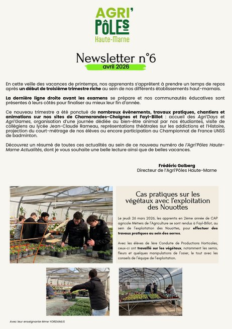 Depuis la fin d'année 2025, l'Agri'Pôles Haute-Marne, le regroupement des établissements d'enseignement agricole public de la Haute-Marne, a mis en place sa newsletter, l'Agri'Pôles Haute-Marne Actualités, pour partager le quotidien de ses apprenants (élèves, apprentis et stagiaires) et leurs projets au fil de l'année.